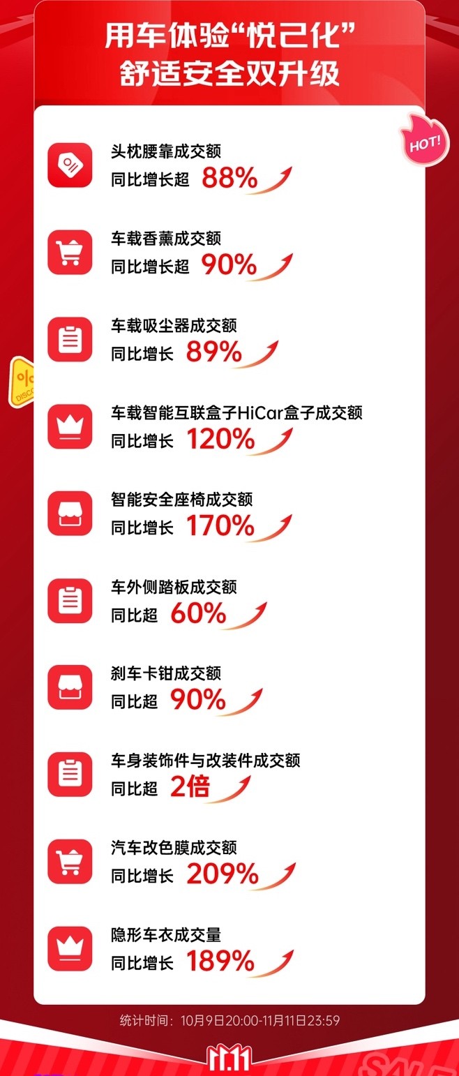 京东汽车11.11期间,智能安全座椅成交额同比增长170%,头枕腰靠成交额同比增长超88%,车载香薰成交额同比增长超90%,车载吸尘器成交额同比增长89%,优化智能互联体验的车载互联盒子HiCar盒子成交额也实现120%的同比增长。同时,超6000万车主在淘宝选购车品,做车后保养,用户对车内舒适配置和个性化装饰的投入持续增加。