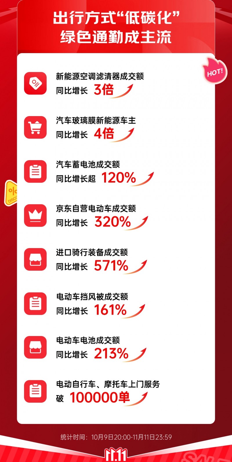 新能源汽车相关消费延续高速增长态势,成为“双十一”购物车中的“重头戏”。天猫汽车双11收官战报显示,新能源车主成交金额双位数增长,超百万车主在后市场购买30万+款商品,乘用车轮胎成交双位数增长,蓄电池流量增长近5成,成交双位数增长;京东数据显示,新能源汽车充电装备成交量同比增长80%,新能源空调滤清器成交额同比增长3倍,汽车玻璃膜新能源车主同比增长4倍,汽车蓄电池品类成交额同比增长超120%。