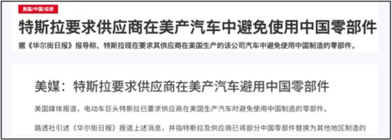 没想到浓眉大眼的特斯拉,也传出要求北美供应商“去中国化”。华尔街日报说,特斯拉在美国制造汽车时,要采用其他国家生产的零部件取代中国零部件,目标是在未来1至2年内全面替换中国零部件。