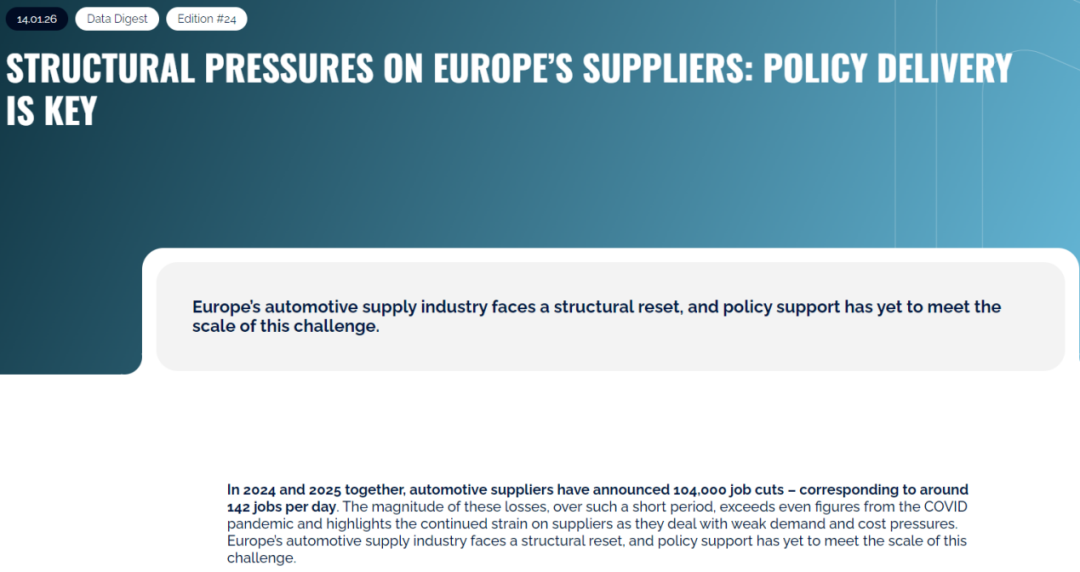 更令人担忧的是,就业市场的“失血”态势难以逆转。CLEPA指出,2025年欧洲汽车零部件行业仅宣布新增7000个工作职位,与高达5万人的裁员规模形成鲜明反差。