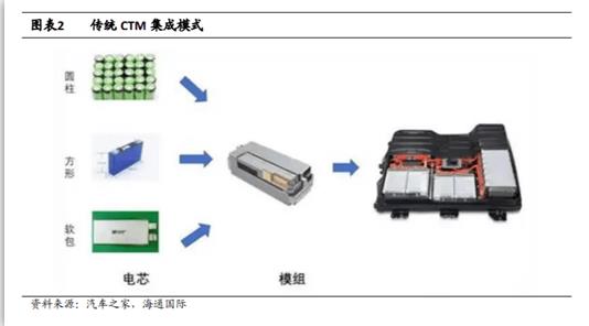 目前大多数品牌为了“求稳”,依然选择采用——CTM传统电池集成方案,即“Cell to Module”。它的特点是先将电芯组成模具,然后再将数个模组集成为电池包,从下部与车身拼接在一起。