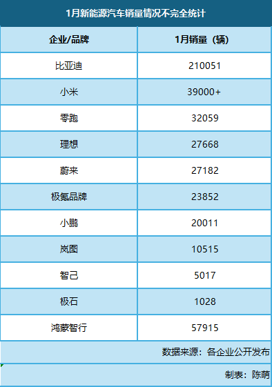 由于新能源车购置税免税政策截止,去年末零售端销量有一定透支,且1月份元旦假期为连休三天,1月车市走势偏弱。不过,从各家发布的战报来看,大多数新能源品牌仍然实现了同比销量增长。