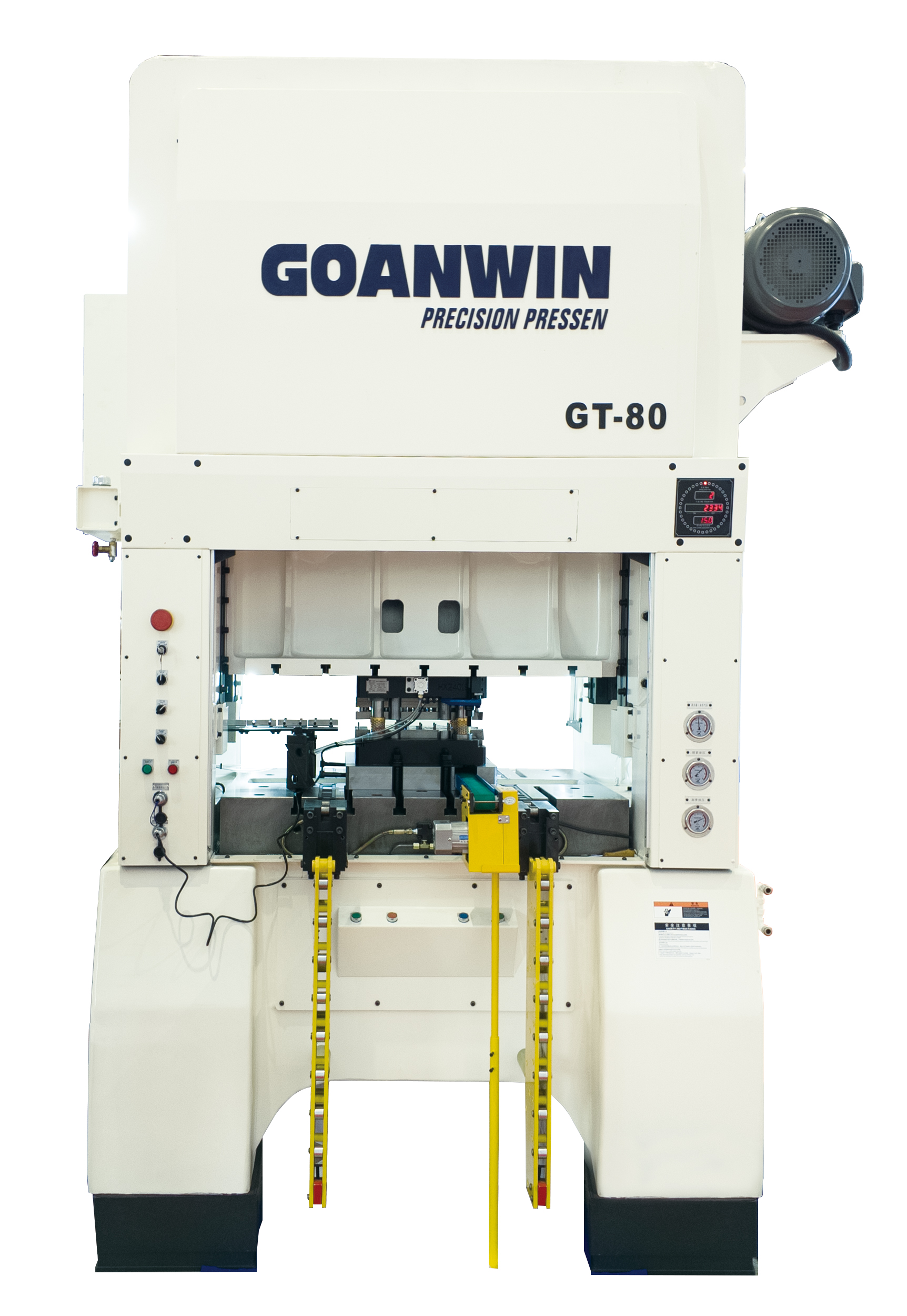 •冲压机采用肘节连杆机构,实现热位移最小、跳屑 最少和精压效果,最适合用于高速精密加工,是一 款具有高可靠性的标准机型;