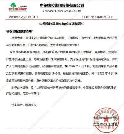 近日,普利司通(中国)、中策、赛轮、万力等多家头部企业发出涨价通知。3月初,已有部分企业率先发布涨价函。据统计,至今已有包含外资巨头与本土龙头在内的超过80家轮胎厂商密集跟进,涨幅普遍在2%至5%之间,调价范围与密集度均为近年少有。